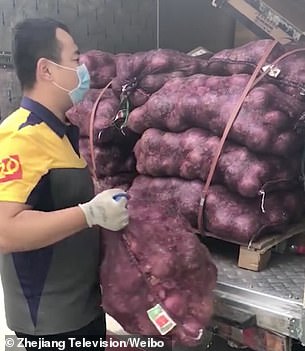 Ms Zhao's ex-boyfriend (pictured) later told Shandong Net that he broke up with the Chinese woman due to her 'crazy behaviours'. He is seen standing at his front door piled with bags of onions on Saturday.