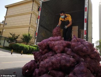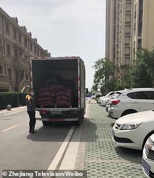 Social media footage showed a delivery driver with a truck loaded with the root vegetables at a residential compound in Zibo, Shandong of eastern China as he tried to get in touch with Ms Zhao's boyfriend on Saturday.